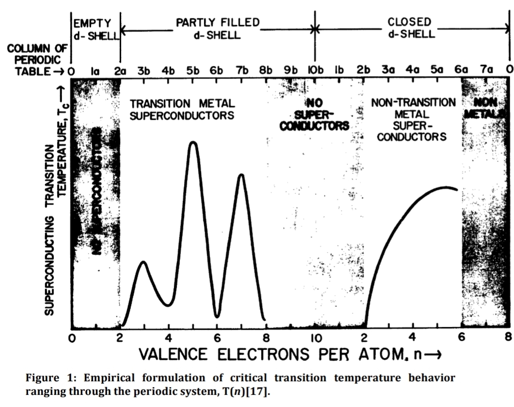 I can't find a copy of the original figure in that paper (and I'm to cheap to spend $35 for a copy right now) but in it he plots perhaps 12 data points and draws by hand two peaks in the superconducting transition temperature vs the number of valence electrons per atom (na). Here's a much later schematic of the plot he made, showing peaks at 5 and 7 na:
